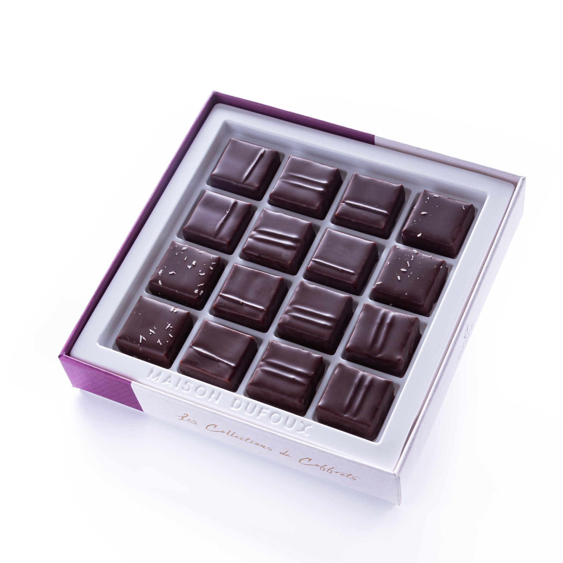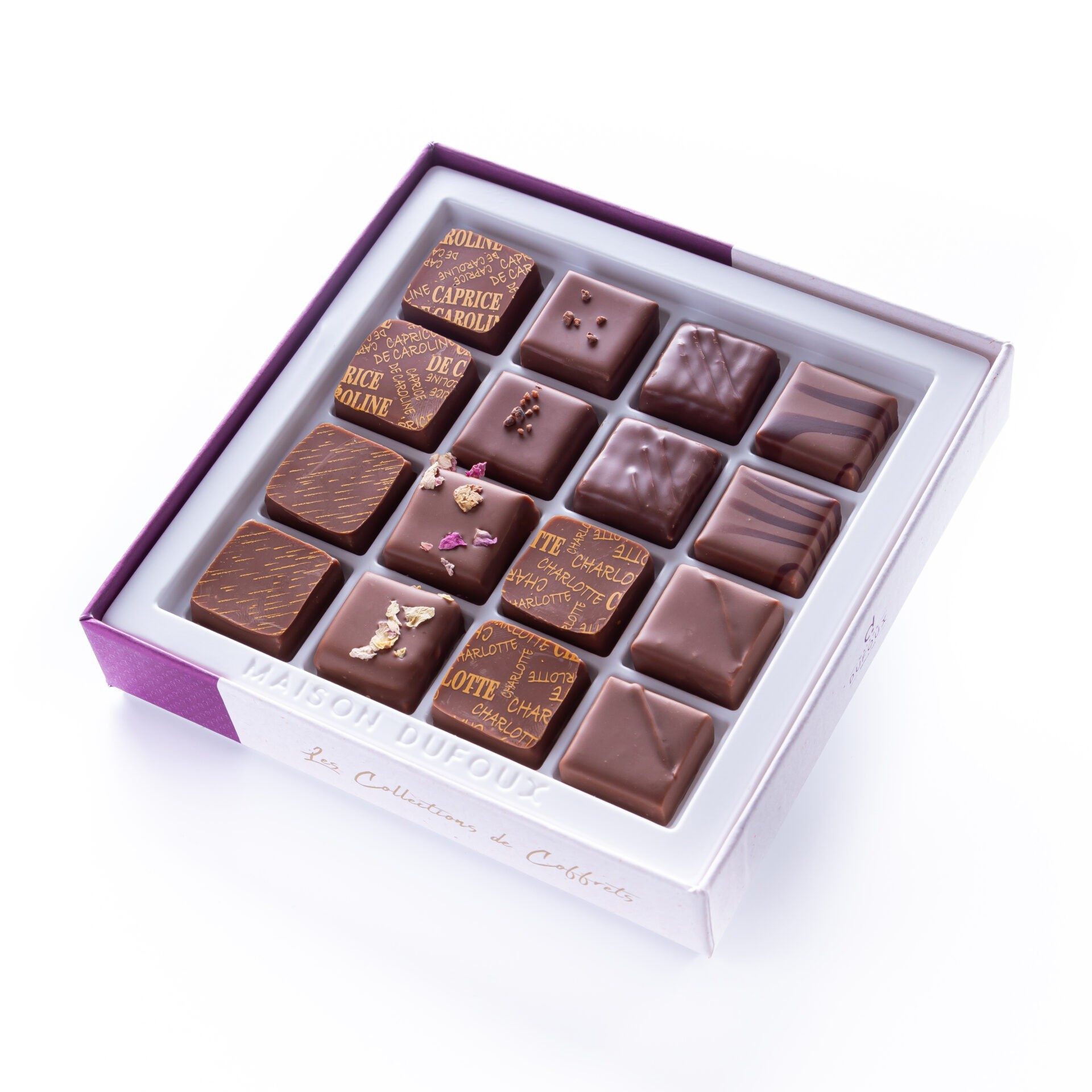Bonbons de chocolat (assortiment des univers Tout Lait, Pralinés, Épicés et Signatures) enrobés de chocolat noir 70% de cacao et chocolat lait 39% de cacao, pur beurre de cacao.