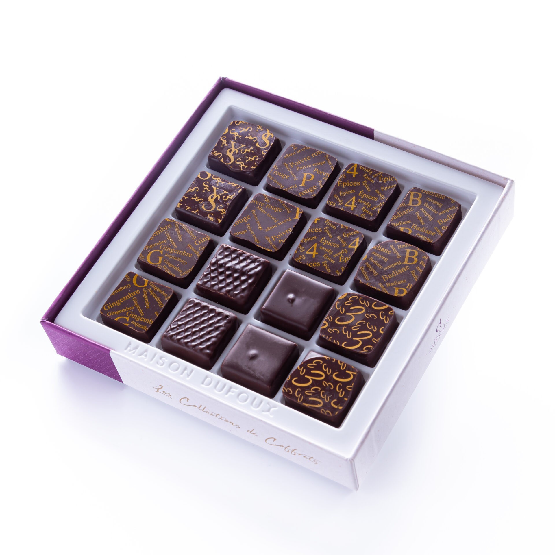 Enrobage chocolat noir (fèves de cacao des Caraïbes, sucre, beurre de cacao, émulsifiant (lécithine de tournesol), extrait naturel de vanille). Enrobage chocolat lait (sucre, beurre de cacao, lait entier en poudre, fèves de cacao, émulsifiant : lécithine de tournesol, extrait naturel de vanille). Selon assortiment : Intérieur : crème, lait, sucre, pâte de cacao, beurre de cacao, amandes, noisettes, pistaches, noix de cajou, feuillantine (gluten), cassis, menthe, alcools, café, thés, passion, épices, vanille, cardamome verte, combava, myrtille, citron, noix de coco, miel, or 22 carats. Marquage : Beurre de cacao, saccharose, colorants : E110, E133.