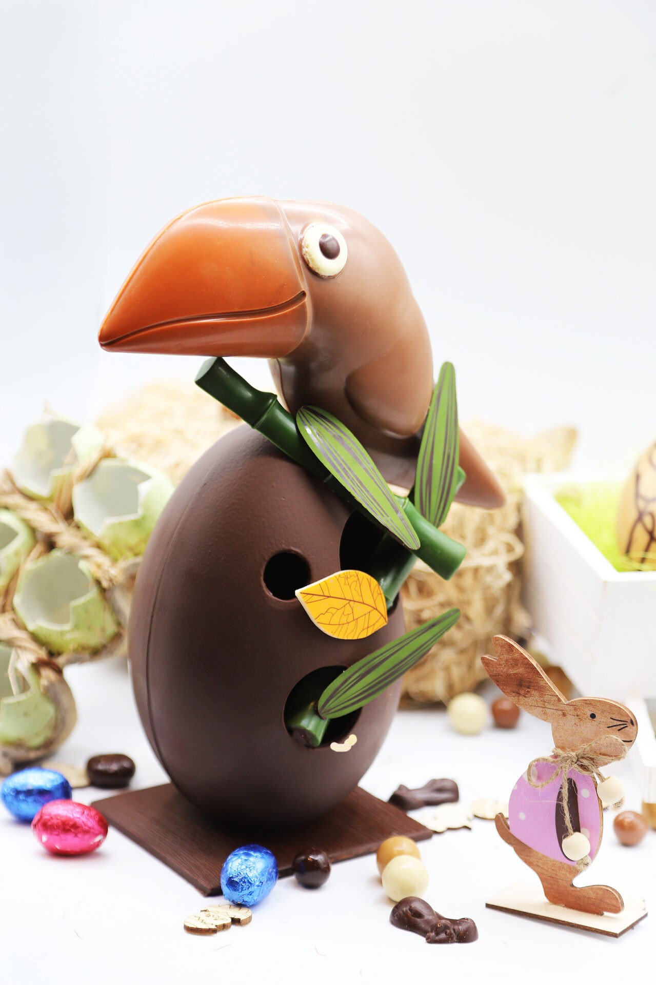 Découvrez Le Toucan, notre création artisanale aux couleurs du voyage. Ce sujet original est disponible en chocolat noir intense ou en chocolat au lait fondant. De plus, il cache une surprise généreuse sous son plumage chocolaté. Il est en effet garni d’un riche assortiment de nos meilleures spécialités de Pâques. C’est ainsi le choix idéal pour apporter une touche d’exotisme et de gourmandise à vos fêtes.