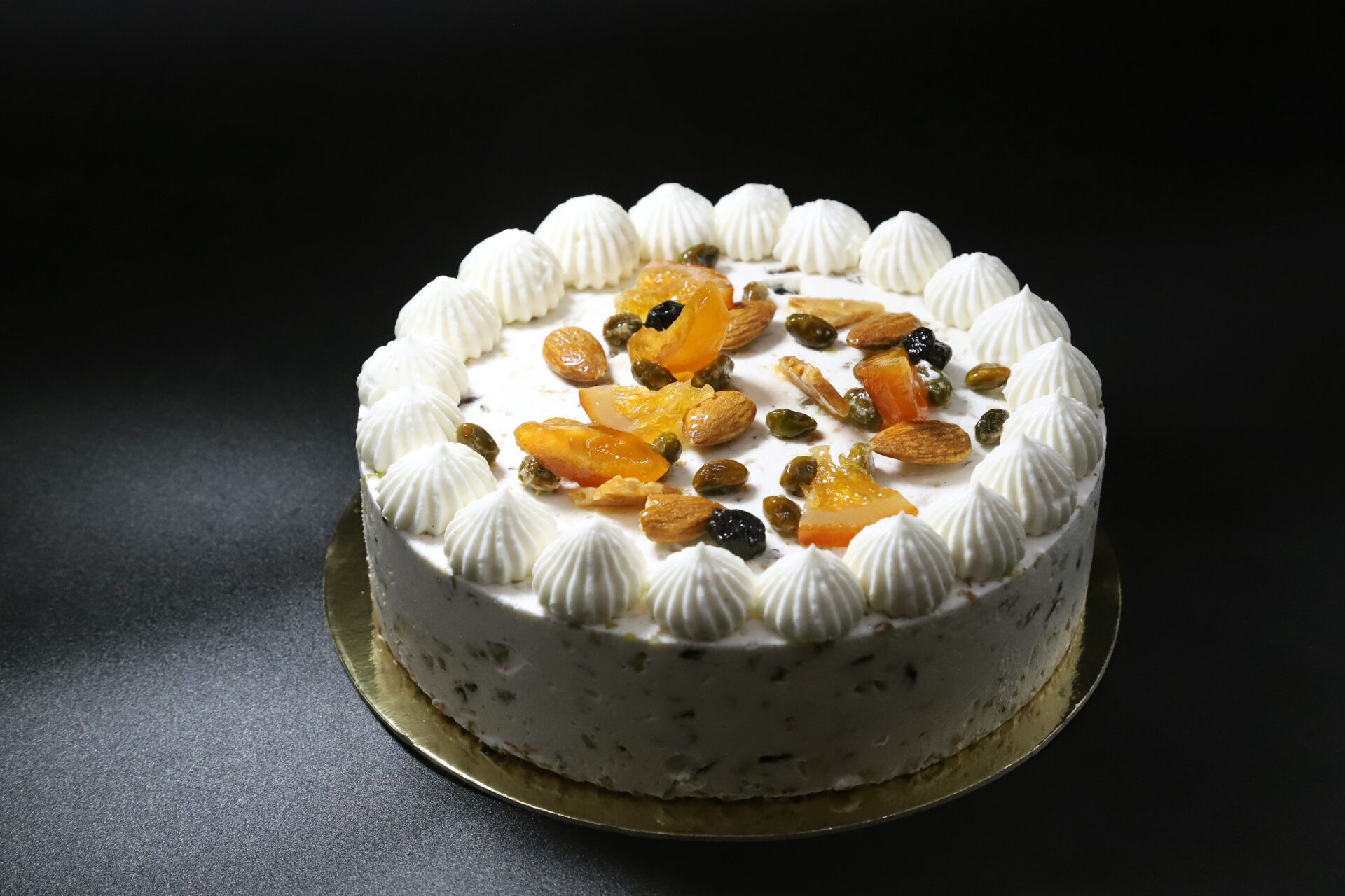 Oreillons d’abricots, crème de lait (stabilisant : carraghénanes), fondant pâtissier (sucre, sirop de glucose (sulfites), eau, acidifiant : E336i), sucre, miel de prairie (7%), blanc d’œufs (épaississant : gomme de xanthane) (4%), noisettes (3%), amandes torréfiées blanchies (2%), écorces d’oranges confites (sirop de glucose, sucre) (2%), beurre 82% mgl, griottes, poudre d’amande, œufs, amidon de maïs, purée de citron, raisins secs, rhum, pistaches (1%), chocolat blanc (35% de beurre de cacao minimum), (beurre de cacao, lait entier en poudre, sucre, émulsifiant : lécithine de tournesol, extrait naturel de vanille), sirop de glucose (sulfites), gousses de vanille, beurre de cacao, lait entier de vache stérilisé (lait origine France), extrait de vanille, poudre de dextrose, gélatine de bœuf.