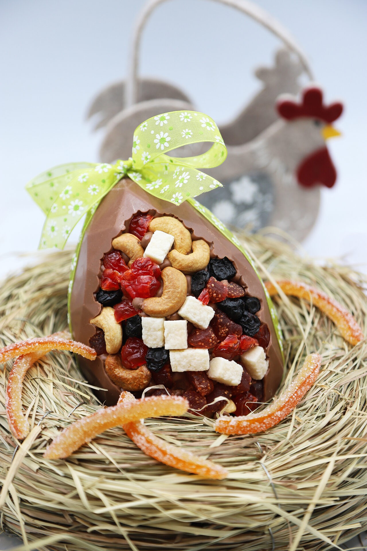 Notre Œuf Gourmand possède un design coloré et très généreux. Sa robe ambrée parsemée de pépites gourmandes en fait ainsi la star de vos paniers de Pâques. De plus, il constitue le présent idéal pour ceux qui aiment les mélanges traditionnels. En effet, sa composition riche rappelle les saveurs des mendiants de notre enfance. Sa garniture abondante permet ainsi de partager un moment de convivialité après votre repas de fête.