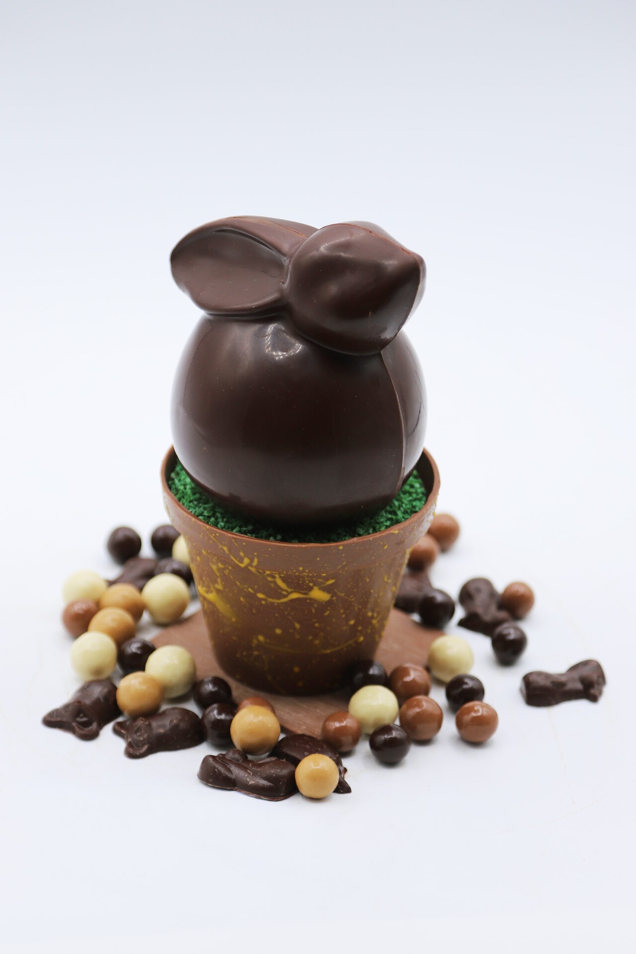 Célébrez le renouveau du printemps avec notre Pot de Lapin en chocolat. Cette pièce exclusive est imaginée avec créativité dans nos ateliers. Elle revisite ainsi les symboles de Pâques de façon moderne et ludique. Grâce à son design original, ce pot attire immédiatement l’attention des petits et des grands. Par ailleurs, ce n’est pas seulement un objet décoratif en chocolat. C’est un véritable coffret de douceurs conçu pour offrir une dégustation variée et joyeuse.