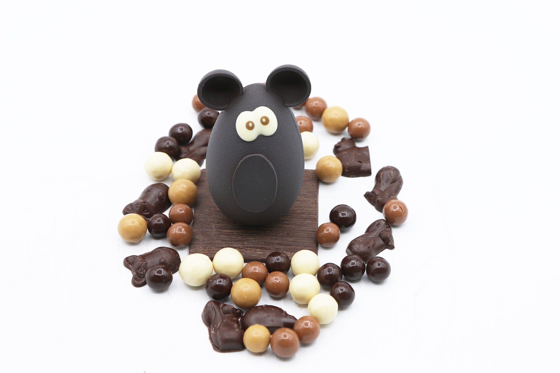 Découvrez la Souris Malicieuse, une création artisanale pour les amateurs de cacao. Ce sujet élégant est moulé dans un chocolat noir de caractère. De plus, il cache une surprise généreuse sous sa coque brillante. Elle est ainsi garnie de nos traditionnelles fritures de Pâques. Vous y trouverez également nos célèbres Chabadas. Ces billes de céréales croustillantes sont enrobées de chocolat noir, lait ou blond. C’est donc le choix parfait pour une dégustation raffinée et surprenante.
